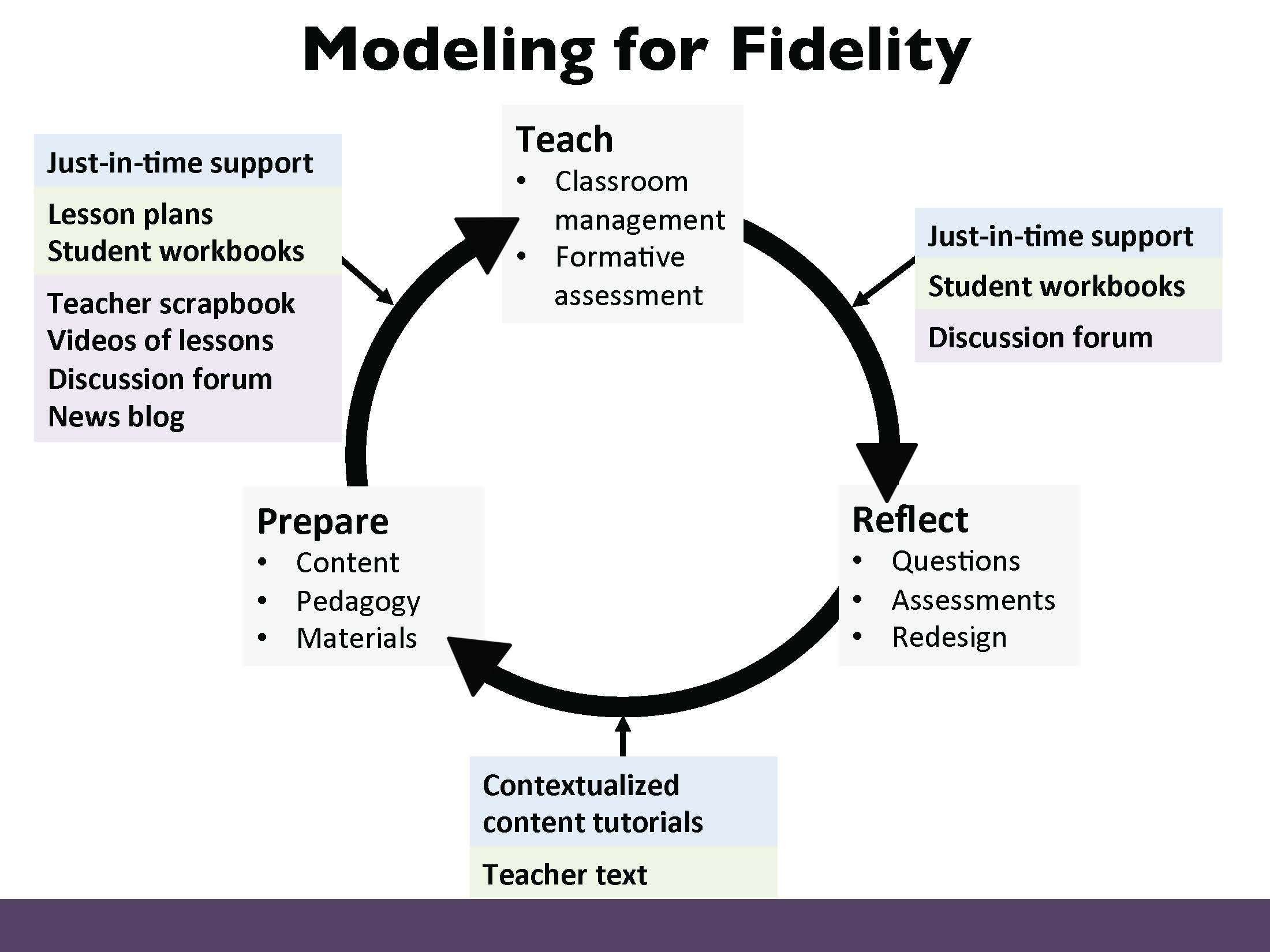 Figure 2. Modeling for Fidelity. The Great Diseases project contains teacher professional development in health curriculum and multiple just-in-time support opportunities to help teachers implement the curriculum effectively.