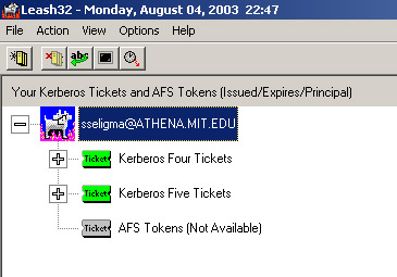 After you have obtained kerberos tickets/tokens you will see your username listed in the kerberos window along with a "+" sign to the left of your name. Clicking the "+" sign will display all the tickets and tokens you currently have. You should have three items listed, kerberos four tickets, kerberos five tickets, and AFS tokens. Green tickets mean they are active, red tickets are expired, gray tickets means a service is unavailable. Once you have obtained your tickets you can close out of the kerberos program. You can always view your kerberos tickets by opening the kerberos program. You can "get", "renew" and "destroy" tickets as often as you need to. The default lifetime for tickets is 8 hours. Tickets are destroyed any time you log off your computer or shutdown your computer. MIT’s Eudora program also uses kerberos. When you are prompted for your username and password within Eudora, the program is utilizing the kerberos program to obtain tickets, because of this, logging into Eudora in effect also logs you into the AFS file system.