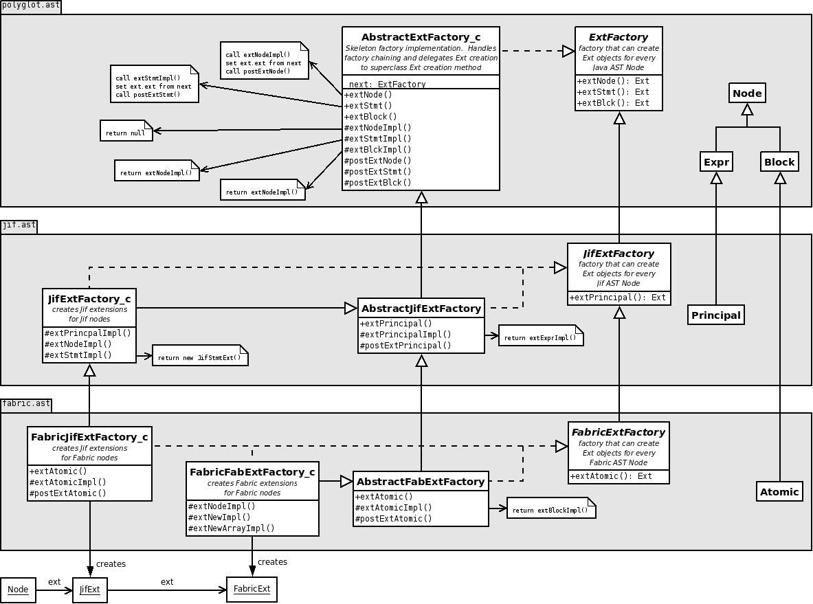 There are a number of factory classes associated with building the extension objects. As documented in the CC'03 Polyglot paper, there should be a separate extension object for each language extension. In the case of Fabric (which is an extension of Jif), a properly constructed fabric node should look as follows: