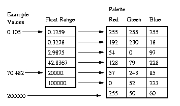 The range index array attribute defines the "to" of the range. Notice that the range index array attribute is one less entry in size than the palette. The first entry of 0.1259, specifies that all values below and up to 0.1259 inclusive, will map to the first palette entry. The second entry signifies that all values greater than 0.1259 up to 0.3278 inclusive, will map to the second palette entry, etc. All value greater than the last range index array attribute (100000) map to the last entry in the palette.