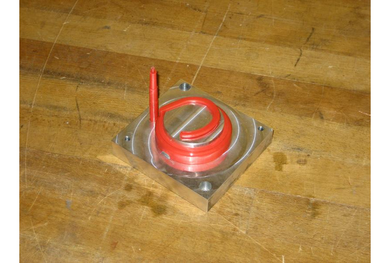 Red polypropylene was shot into our mold. Flash around the mouse-hole is visible.