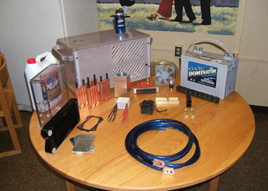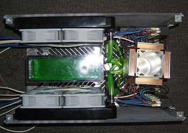 | The heart of AbsolutZero. Eight thermoelectric cooling modules are sandwiched between four cooling blocks and the cooling chamber. |