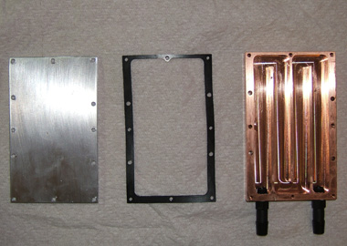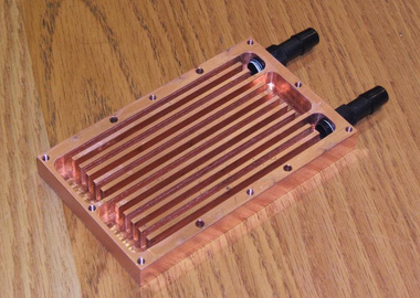 A custom-machined copper liquid cooling block for the thermoelectric cooling modules. |