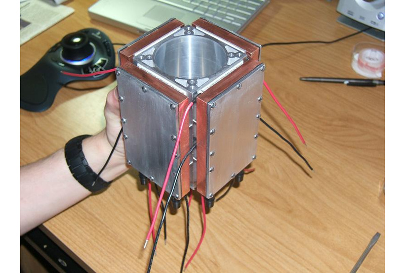 The heart of AbsolutZero. Eight thermoelectric cooling modules are sandwiched between four cooling blocks and the cooling chamber.