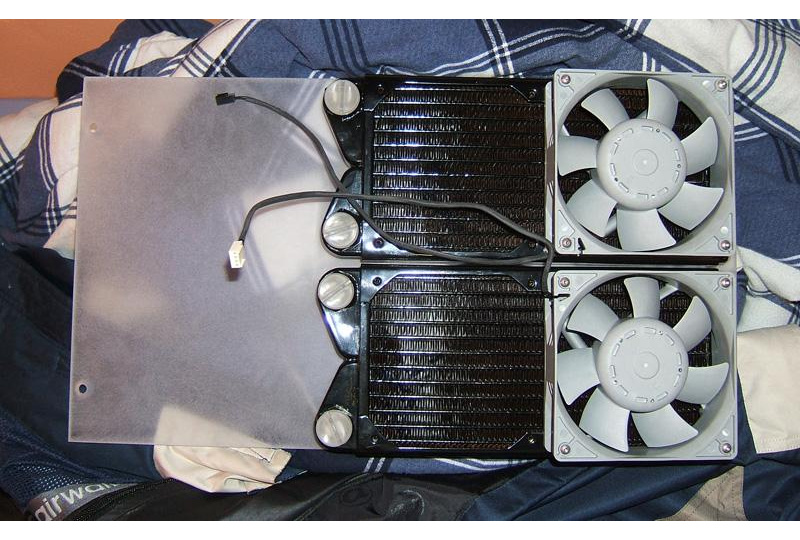 Radiators and fans mounted to a side panel.