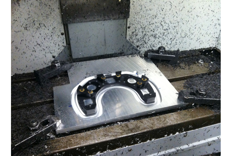 The main delrin housing being machined from multiple sides using a nest fixture, on a machining center at the MIT Edgerton Student Shop.