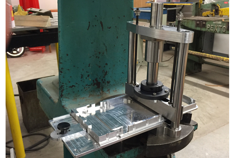 We designed a custom bending fixture to create the correct radius while clearing various machined features.