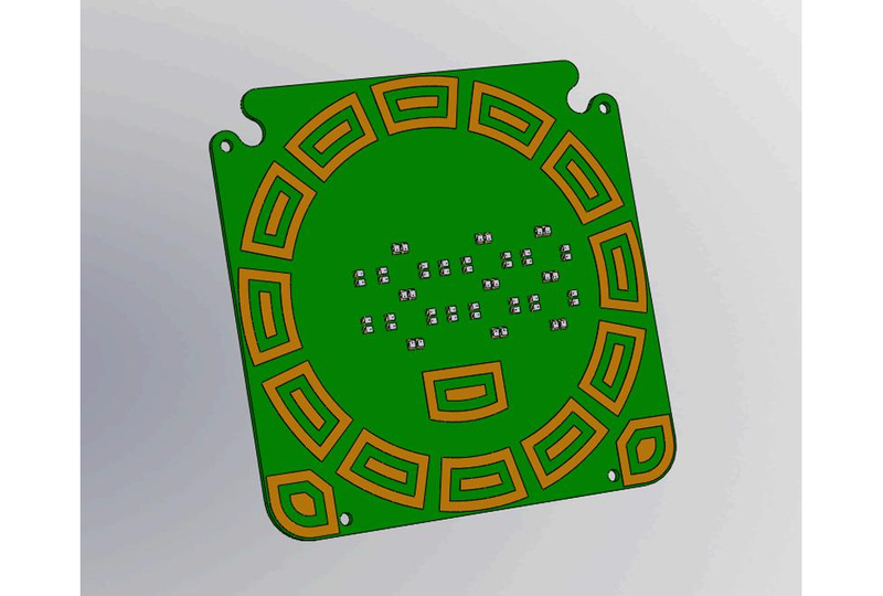Capacitive touch sensors are built as traces on the PCB. These and LED placement were designed in the context of the solid model.