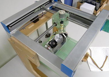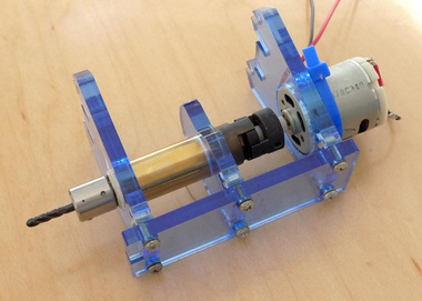 | Besides PCBs, the spindle can be used to cut thru plywood. In this case it made the front face of a radio designed by David Mellis. |