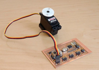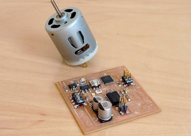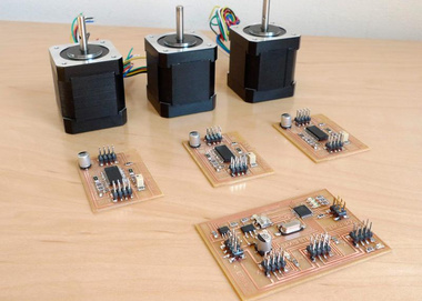 | These milled PCBs provide networked control of three stepper motors. Additional motors can be controlled by adding another board to the network. |