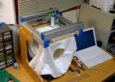 For MIT's New Textiles class: a passive pen holder and a laser-cut stretch frame were used to decorate T-shirts. |