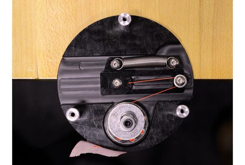 A spring-loaded tensioner keeps the thread taut through the puck's range of motion.