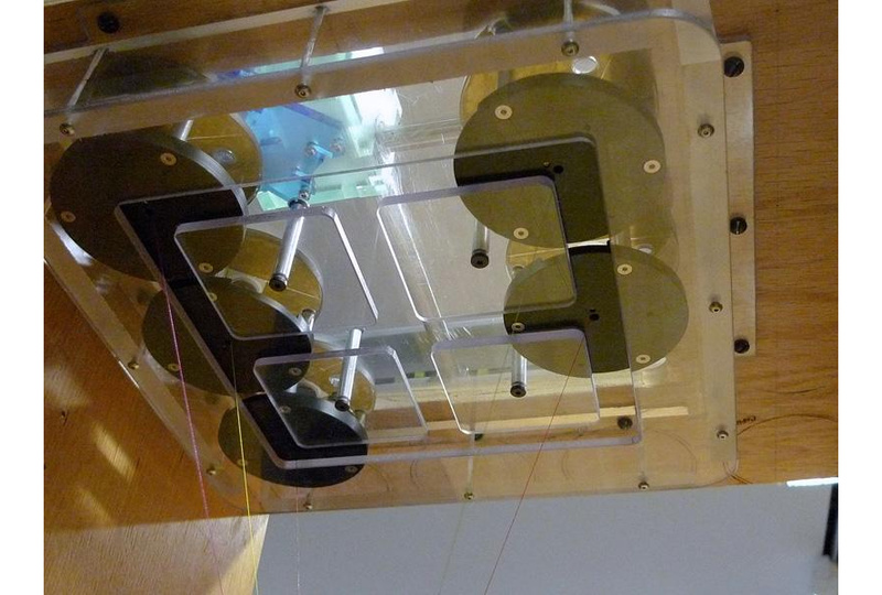 The pucks are supported on an acrylic grid with slots for the threads to pass.