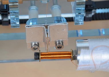 Magnet wire passes through a moving aperture and is wound up on a spinning core. |