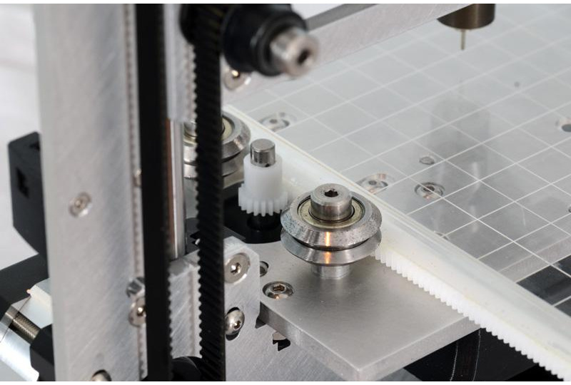 A rack and pinion drives the work table in the Y axis, while four V bearings provide support.