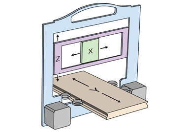 | A rack and pinion drives the work table in the Y axis, while four V bearings provide support. |