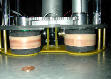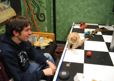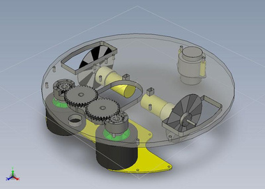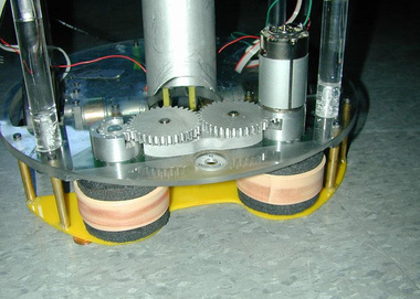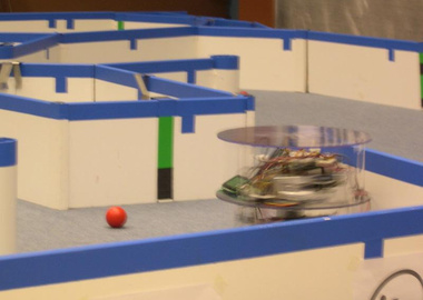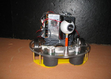 Selected Design Features: One of the major challenges posed by the course was to avoid becoming lodged in corners. A round body with wheels located along a diameter allows our robot to spin in place if it becomes stuck. Also, an array of IR range-finding sensors supplements the camera data and helps prevent the robot from bumping into walls. When it comes time to collect and dispense balls, a set of foam-encircled rollers coerces the balls into a holding pen. These rollers are driven by a single motor and are geared to ensure that they spin in opposite directions at the same speed. Finally, an onboard VIA computer runs the Java control software and vision algorithms.