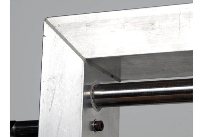 Precision guide rails pierce the aluminum frame thru oversized holes.