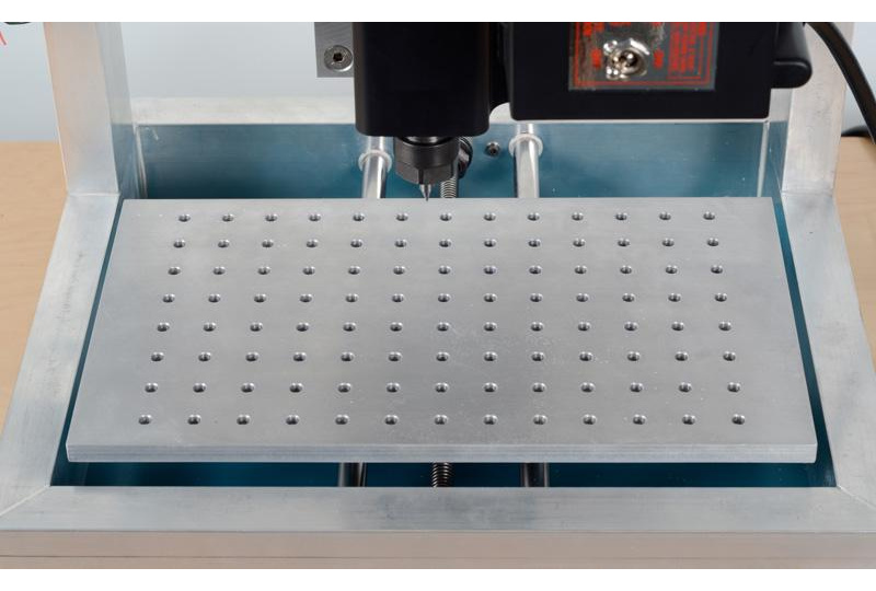 The work surface is machined from cast aluminum and has 104 mounting/locating holes for aligning and fixturing work.