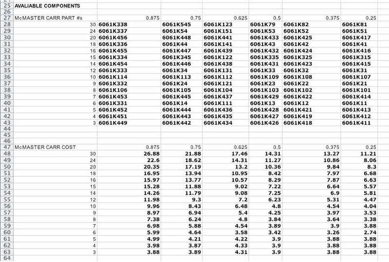 Avaliable component sizes, along with their part numbers and prices, are organized in tables. From these tables optimal components are automatically chosen.