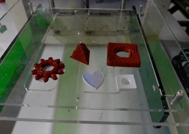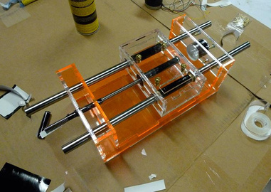 Technical Approach: We began by casting a leadscrew driven single-axis motion stage as a test of several techniques that we developed: insert casting of motion components such as bushings and leadscrew nuts, the use of laser-cut acrylic as a mold, and insert casting of threaded inserts. This experience informed our design of a full 3 axis 3D printer, which we cast in two pieces. The first was a four-legged base with an integrated Z axis, and the second was an XY stage in the spirit of the Foamcore CNC project. The plaster XY assembly was later replaced with an acrylic version as machine development progressed beyond the self-imposed material constraints.