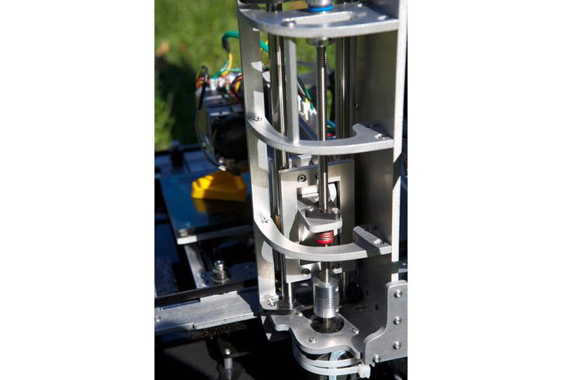 The leadscrew-driven Z axis is constructed of waterjet-cut ribs, and uses a similar bearing system to the X and Y axes.