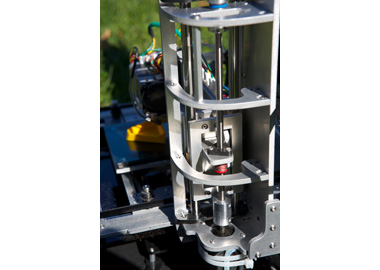 The leadscrew-driven Z axis is constructed of waterjet-cut ribs, and uses a similar bearing system to the X and Y axes. |