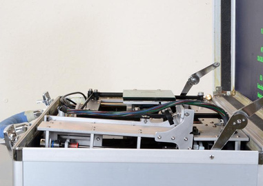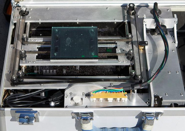 | The XY motion stage is based on the CoreXY platform. The Z axis arm folds around it. |