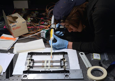 | Popfab was born in the basement lab of the CBA. Here Nadya epoxies the bearings in place. |