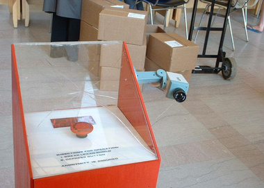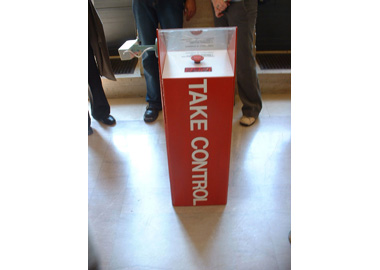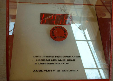Selected Design Features: Several protective measures have been taken to prevent the stopping of time: a lexan shield physically protects the button while a camera dutifully records who has broken the rules as a way of forcing the transgressor to assume responsibility. Several seconds of scrutiny reveal that the "lexan shield" has already been broken, the button depressed, and time stopped. We chose to pre-break the shield as a suggestion that rules, like glass, become more visible once broken.