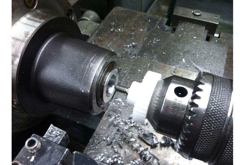 Here you can see the drive gear being pressed into the back of the encoder wheel on the lathe, to help improve concentricity.