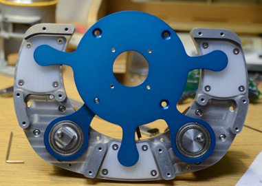 | The positioning linkage, made from anodized aluminum. Lollipop-shaped protrusions are used to constrain the large plate. Note that the bearings are missing the eccentric plugs that couple to the drive motors. |