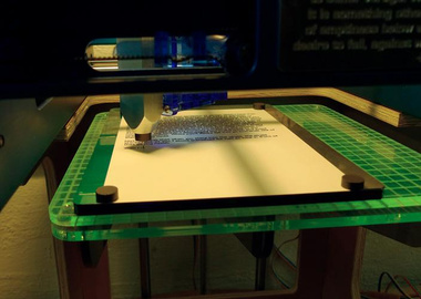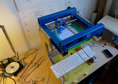 Initial prototyping of code at my apartment in Harvard Square. Note how the pen is zip-tied to the machine. |