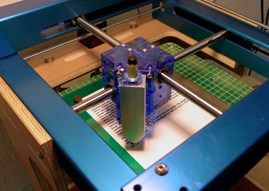 | A gravity-preloaded pen holder applies a constant tip pressure irrespective of variations in paper height. |