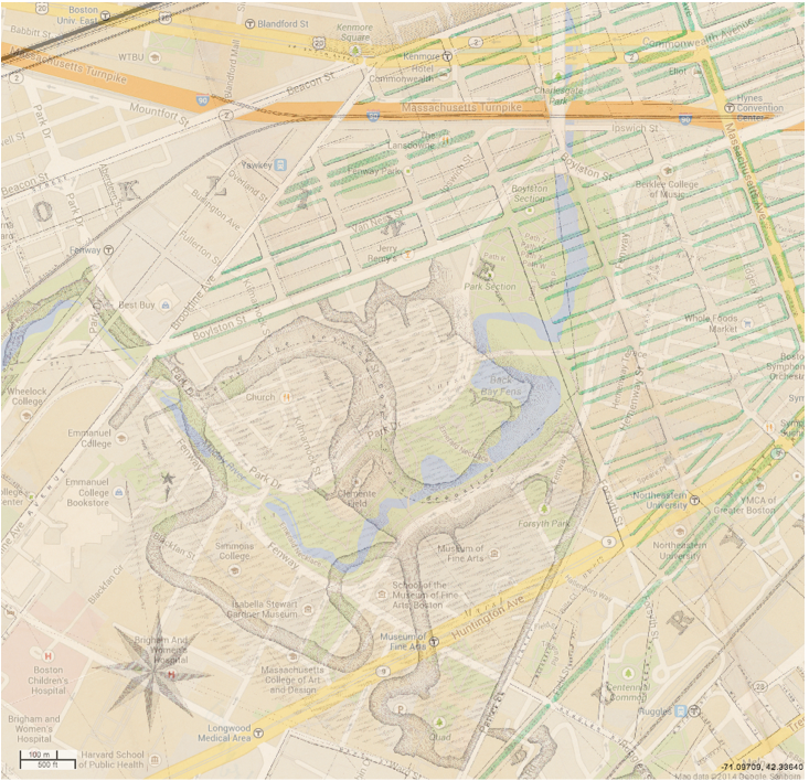 The second sub-site was originally covered by the shallow, polluted waters of the Muddy Charles, until it was reclaimed by Olmsted’s transformative Emerald Necklace project. Figure 2 depicts the site before the Emerald Necklace, with the Muddy River bounded to the north by Boylston Street. Figure 2 shows the proposed street grid of the site by Olmsted, overlaid over the present day street grid of Google Maps. It is notable that the plan for the Emerald Necklace actually opened up public land for development, instead of utilizing the reclaimed land for public development. This change in land use was motivated by the intense pressure in Boston to acquire more developable land, so Boston could compete economically with other rapidly growing American cities like Chicago and Los Angeles, as Professor Spirn mentioned in class. [6]