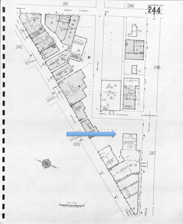 Figure 4. Sanborn Fire Insurance Maps 1992. The top image shows the first sub-site, bounded by Brookline Avenue and Boylston Street. It highlights the future location of the new Fenway Triangle Trilogy development, visible in Figure 5. The bottom image shows the second sub-site, and highlights a parking lot that is the future location of Ramler Park. Roach Library.