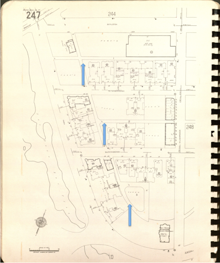 By the time the first apartments were built in 1908, widely available city services required such allies for utilities for the multistory, multi-family apartment buildings that were standard in South Fenway. These laws were manifested in the developments – they are visible in Figure 6, a 1974 Sanborn Map. Later, with the widespread prevalence of the automobile but not enough supporting infrastructure, many of these alleyways were used for parking vehicles of residences, a practice that is now ubiquitous.