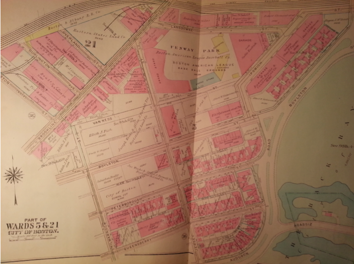 Despite the concessions made to the automobile, walking remained a major mode of transportation. The Bromley property maps indicate that many of the buildings were owned by nearby Simmons College, housing either staff or students (Figure 7). The 1917 map also shows some of the property was also originally allotted to the “President & Fellows of Harvard College,” likely so the president could oversee Harvard Medical School, also located in the Longwood Medical District across the Emerald Necklace (Figure 8).
