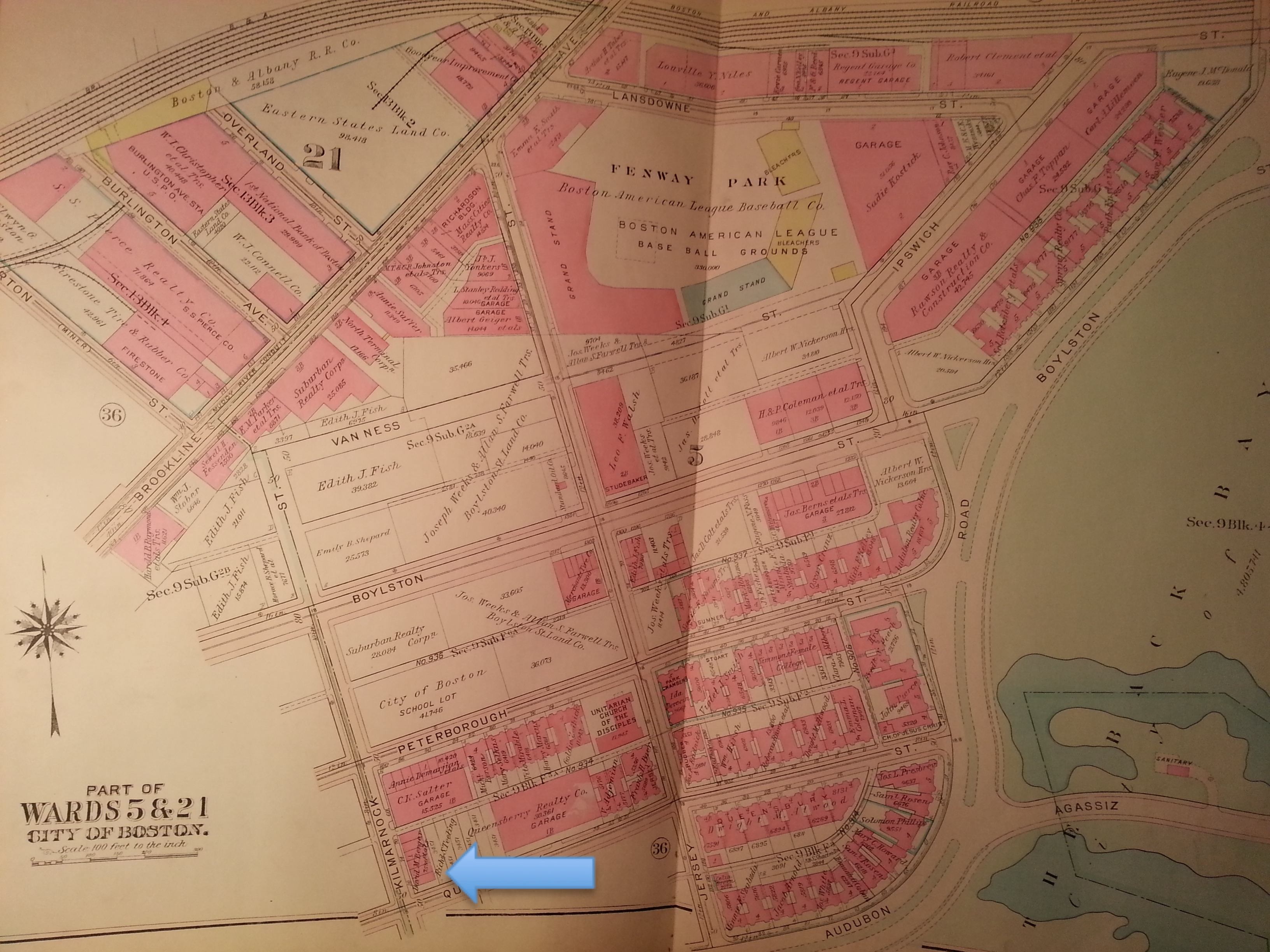 Figure 14. The building in the background in Figure 12 is highlighted on this map. Bromley 1928, via Massachusetts Institute of Technology Roach Library.