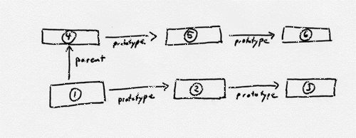 Order of lookups in a two-deep scope chain with prototypes.