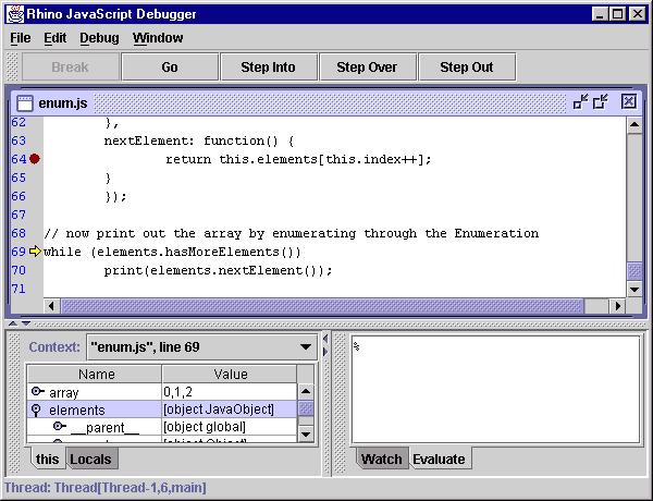 The Rhino JavaScript Debugger can debug scripts running in multiple threads and provides facilities to set and clear breakpoints, control execution, view variables, and evaluate arbitrary JavaScript code in the current scope of an executing script.