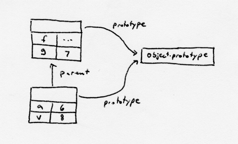 Order of lookups in a two-deep scope chain with prototypes.