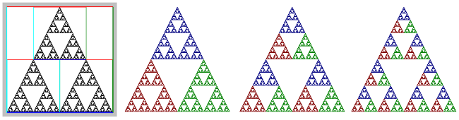 Here is an example. The image on the left is the Sierpinski Triangle example with no color coding and with the outlines of the maps shown. The next three images show the triangle (without the maps), with the color coding level set to Level 1, Level2, and Level 3 respectively: