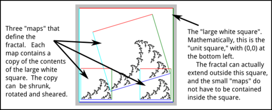 The six numbers that define a map have the following meaning: The big white square in the program is the "unit square." In terms of (x,y) coordinates, the lower left corner of the square is (0,0), the lower right corner is (1,0), the upper left corner is (0,1) and the upper right corner is (1,1). To define a map, you just have to say how the map transforms the points (0,0), (1,0), and (0,1). That is, where do those three points go when the map is applied to them? (What happens to any other point, including (1,1) is determined by what happens to those three points.) In the data for the map, the first two numbers are the coordinates of the point to which (0,0) is mapped; the third and fourth numbers are the coordinates of the point to which (1,0) maps; and the fifth and sixth numbers are the coordinates of the point to which (0,1) maps.