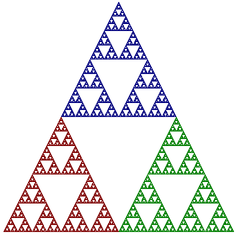 But it's easier to say what the image looks like: The Sierpinski image for Color Level 2 consists of three half-size copies of the image for Color Level 1. This lets you see how the complete triangle is made up of nine quarter-sized copies of itself. Similarly, the Level 3 image consists of three half-sized copies of the Level 2 image.