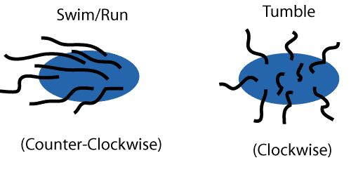 E. Coli is an example of a bacterium that uses the run and tumble method to randomly walk. When the flagella rotate counter-clockwise, they cause a swimming motion, and when they rotate clockwise, they cause a tumble. The cartoon below illustrates this principle.