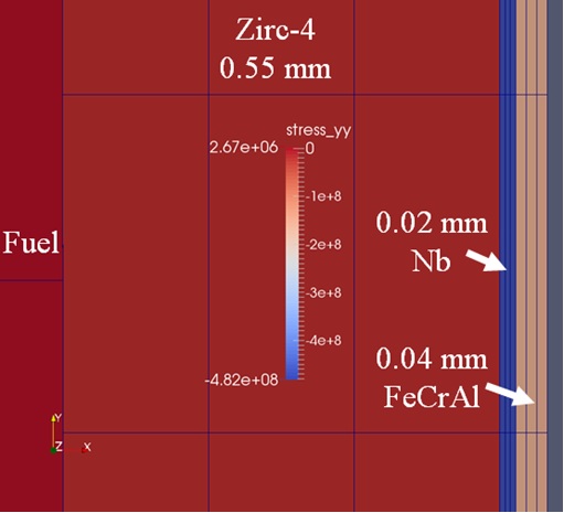 Simulation of double coated fuel cladding. The diffusion barier (Nb) is coated underneat oxide protective layer FeCrAl to avoid Fe + Zr eutectice formation.