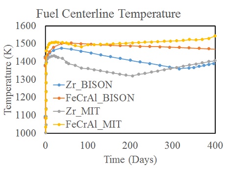 Simulation of fuel with monolithic Zircaloy and FeCrAl alloy demonstrating its lack of creep down as well as comparison of predictions between different tools.