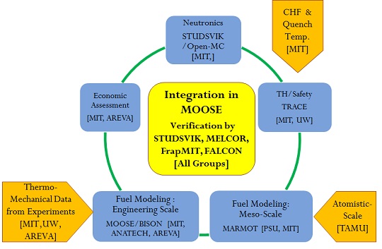 The work combines strong university capabilities of Massachusetts Institute of Technology (MIT) with its experience in reactor and fuel design, neutronics and thermo-mechanical performance and safety analysis, University of Wisconsin (UW) with its experience in severe accident modeling and development of cladding coatings for the US ATF industrial campaign, Texas A&M University (TAMU) with its material ion irradiation capability and experience in atomistic scale simulations and Pennsylvania State University (PSU) with its meso-scale fuel performance modeling to address the development of computational tools necessary for evaluation of ATF concepts. Since NEAMS tools are currently being developed predominantly at Idaho National Laboratory (INL), INL is a member of the research team to allow for efficient implementation and integration of models. The largest challenge of this effort is development of the capability for simulation of integral fuel performance under accident conditions. This is addressed through close collaboration of the US university partners with ANATECH Corporation, which has developed such models for conventional LWR fuel system and AREVA, which is leading one of the industrial efforts in the current ATF campaign of US DOE and one of the three nuclear fuel suppliers in the US.
