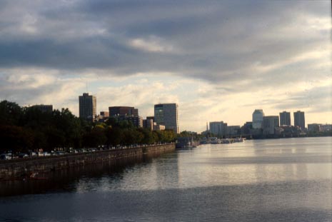 When clouds mostly cover the sun and sky, the riverscape becomes more silver than golden. Different textures appear on the river in relationship to the breezes moving the surface of the water. In some places the texture allows the water to shine; in others it mutes the tones of the water. |